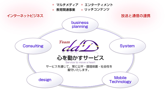 チームddDはインターネットビジネスに於ける各フィールドのスペシャリスト集団です。各フィールド間での連携体制によるトータルコーディネートを可能としております。